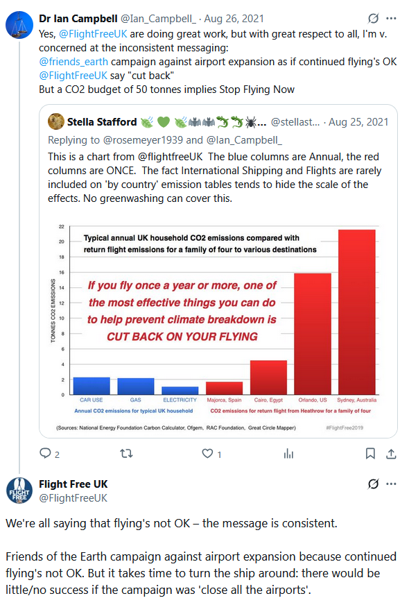 An implication of the Paris Agreement is that leisure aviation would be phased out quickly, e.g. within a year in high emission countries such as the UK. This is because global CO2 emissions needed to be halved by 2030 in order to meet the 1.5° commitment, and the halving of emissions needed to be twice as quick in high emission countries (to comply with the Paris Agreement commitment to equity between countries), requiring annual emission cuts of over 10% - and cutting out leisure aviation is the easiest change to make.But climate campaigners have been very reluctant to say this - see the exchange on Twitter. So the crucial information about urgency of change has been suppressed, and leisure aviation has not just continued, but there are plans to increase it.