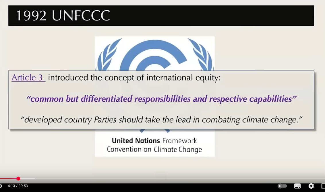 And the second part in Article 3, which is also very important and has been pretty much treated just with lip service ever since by the Global North, is that we would cut emissions fairly under this rubric of common differentiated responsibilities, CBDR as it's often called. But basically that means we would cut emissions to avoid dangerous levels of climate change and we would cut them fairly with developed nations, and there was a category of developed and developing nations, taking the lead.