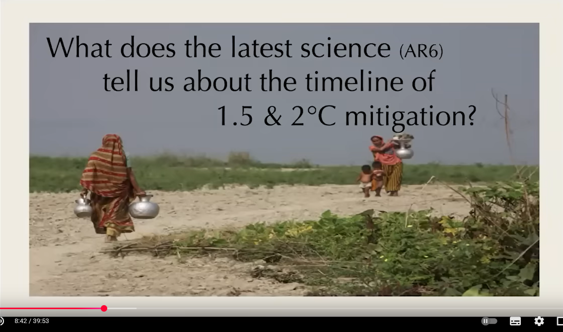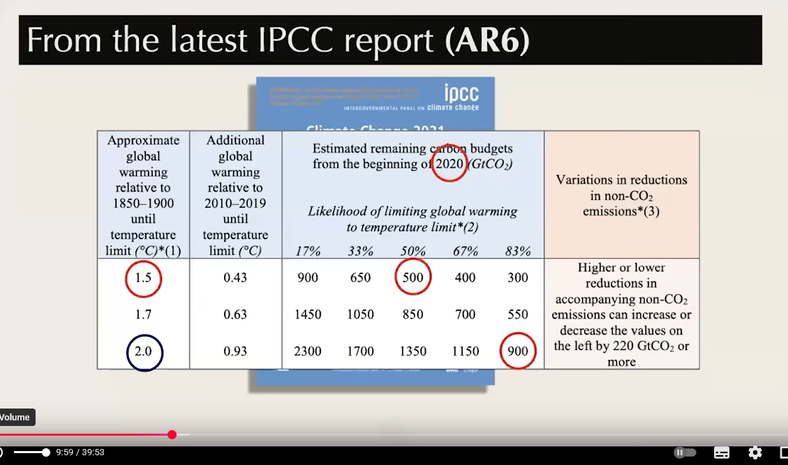 So if you want a 50/50 chance of 1.5, then according to the IPCC, back in 2020, you could emit about 500 billion tonnes of carbon dioxide. And that probably doesn't mean too much to many of you, and I'll come back to these numbers in a minute, if you were staying below 2°C, well below 2, then you get a budget that's not far off twice as big as that, a little bit less, 900 billion tonnes.But that was 2020. Since Paris, we've emitted into the atmosphere, what, 200 or so billion tons of carbon dioxide. Sorry, since Paris, since the IPCC reports. Since Paris, we've emitted about a third of a trillion tons of carbon dioxide in the atmosphere. Every year, we're putting 41, 42 billion tonnes of carbon dioxide into the atmosphere. And that's building up year on year. So I think it is time now in 2025 that we revisit the science that fed into the IPCC. And it's the same scientists that are doing this work. And if you look at some of the papers that are out recently, we've got an improved understanding of a number of factors. Probably most important of these is aerosols. So as we clean up fossil fuels, and in theory, then as we stop using them, that's not happening yet, but as we stop using them, but as we clean them up, we're getting less aerosols in the atmosphere. And the aerosols in the atmosphere actually have been acting like a cooling blanket. So they've been reflecting some of the heat. So the heat that we've generated from more carbon dioxide has to some degree been compensated by the aerosols. And we're getting a much better understanding of that. And a number of other factors here, we're getting improved understanding since the last IPCC report. So I think it's really important for us to revisit the science and what does that tell us?