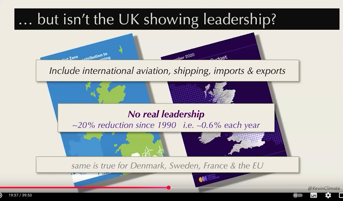 But the language you get, I hear the language in Sweden, I hear the language in France and Denmark, every country says this, every country is a leader on climate change. So we hear that sort of language in the UK. The UK is the first major economy to halve emissions between 1990 and 2022. But if you add in international aviation and shipping, if you add in trade i.e. imports and exports, then the reduction for the UK is about 20%, which is still better than Sweden, which is probably somewhere about 15%. If you look at Ireland, it's gone up actually a little bit since 1990. So, the UK is just not as bad as some of the others. But it's still only about 0.6% per annum reduction each year. Remember, we need about 14% for 2°C. But as I say, it's not as if the UK is doing any worse than some of the other so-called climate-progressive countries. There are no climate-progressive countries in the Global North.